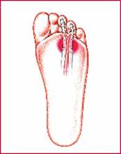 The interlocking mechanism of the midfoot bones maintains the Transverse Metatarsal arch (top of foot), and allows for the proper function of the foot and its soft tissues. When the foot bones become misaligned (due to trauma, prolonged standing, or poor fitting shoes) the bones can compress the small sensory nerves between the toes, usually between the 2nd and 3rd, or 3rd and 4th toes, causing pain and swelling between the toes.